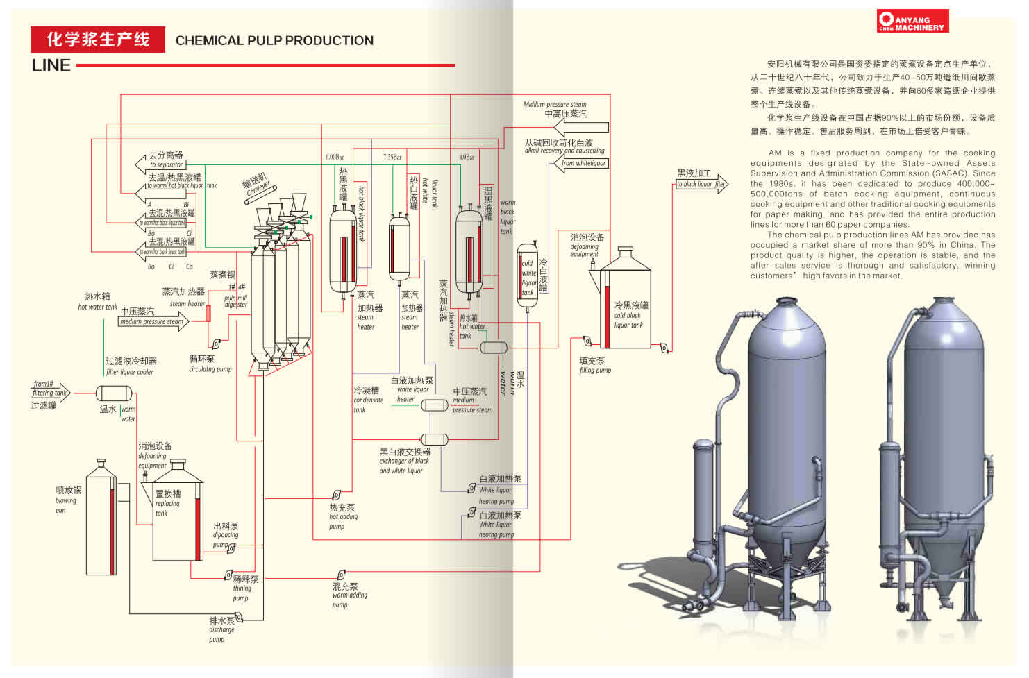 我公司為國(guó)資委指定的蒸煮設(shè)備定點(diǎn)生產(chǎn)單位,從20世紀(jì)80年代,公司致力于生產(chǎn)造紙用間歇蒸煮、連續(xù)蒸煮等設(shè)備?;瘜W(xué)漿生產(chǎn)線設(shè)備在中國(guó)占據(jù)90%以上的市場(chǎng)份額,設(shè)備質(zhì)量高、操作穩(wěn)定、售后服務(wù)周到,在市場(chǎng)上備受客戶青睞。其中,我公司自主研發(fā)的年產(chǎn)量30萬噸的超級(jí)間歇蒸煮工藝,采用自動(dòng)化控制系統(tǒng),紙漿生產(chǎn)質(zhì)量穩(wěn)定,較傳統(tǒng)的蒸汽耗費(fèi)更少,成本大幅度降低,其紙張卡帕值更低、強(qiáng)度更高,國(guó)內(nèi)市場(chǎng)占有率達(dá)95%以上。