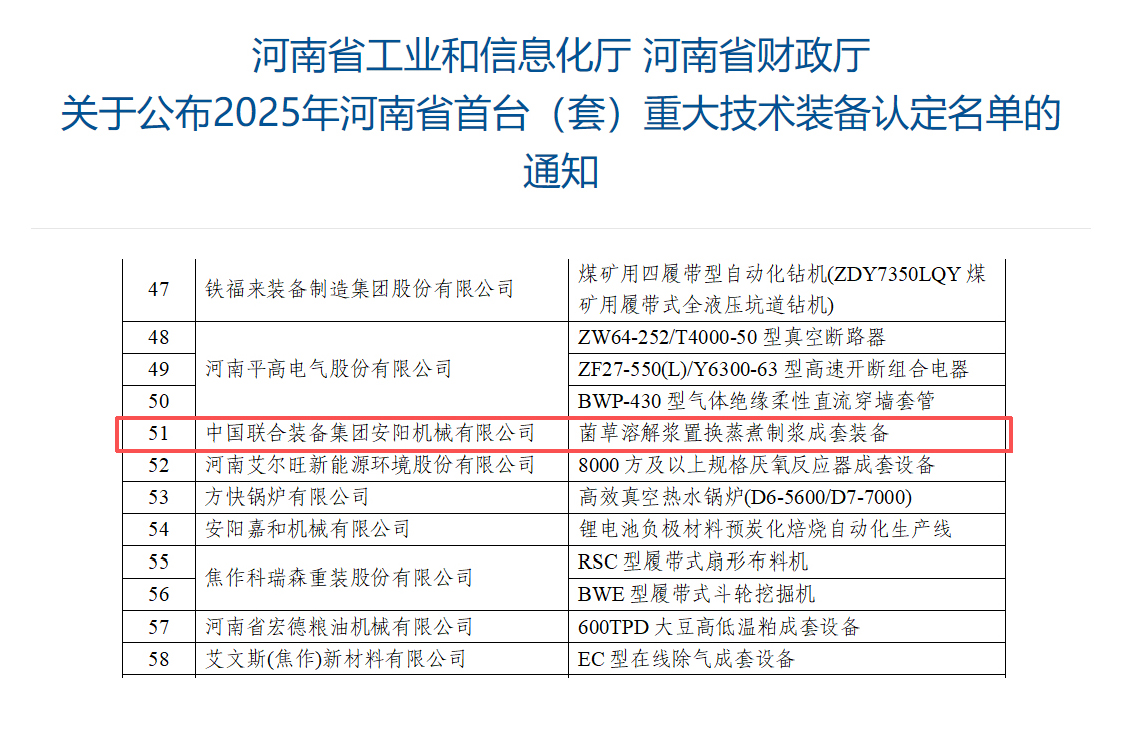 近日,河南省工業(yè)和信息化廳正式公布2025年河南省首臺(套)重大技術(shù)裝備認(rèn)定結(jié)果,中國聯(lián)合裝備集團安陽機械有限公司(以下簡稱“安陽機械”)自主研發(fā)的菌草溶解漿置換蒸煮制漿成套裝備成功入選。這一認(rèn)定不僅是對安陽機械技術(shù)實力的高度認(rèn)可,更標(biāo)志著我國在非木漿制漿裝備領(lǐng)域?qū)崿F(xiàn)重大技術(shù)突破——成功破解溶解漿原料“卡脖子”難題,為綠色制漿產(chǎn)業(yè)的革命升級注入強勁動力。作為造紙及生物質(zhì)材料產(chǎn)業(yè)的核心裝備,該成套裝備實現(xiàn)了從“以草代木”到“高效低碳”的裝備革命,開啟行業(yè)發(fā)展新征程。