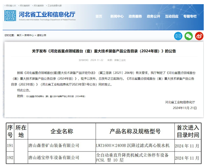 11月21日,河北省工業(yè)和信息化廳發(fā)布了《河北省重點(diǎn)領(lǐng)域首臺(tái)(套)重大技術(shù)裝備產(chǎn)品公告目錄(2024 年版)》,唐山森普“LWZ1600×2400B 沉降過(guò)濾式離心脫水機(jī)”和唐山通寶“全自動(dòng)垂直升降類(lèi)機(jī)械式立體停車(chē)設(shè)備PCSL 型10層”成功入選。