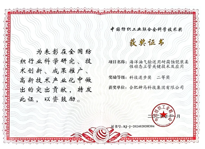 合肥神馬參與研究的“海洋油氣輸送用耐腐蝕鎧裝柔性動(dòng)態(tài)立管關(guān)鍵技術(shù)及應(yīng)用”項(xiàng)目榮獲中國(guó)紡織工業(yè)聯(lián)合會(huì)科學(xué)技術(shù)獎(jiǎng)的科技進(jìn)步獎(jiǎng)二等獎(jiǎng)。在此項(xiàng)目中,公司與管道制造企業(yè)密切合作,成功研發(fā)了海洋柔性動(dòng)態(tài)立管成套裝備。這一突破性成果為中國(guó)海洋資源的開(kāi)發(fā)與利用提供了堅(jiān)實(shí)的裝備保障,進(jìn)一步推動(dòng)了中國(guó)海洋工程領(lǐng)域的高質(zhì)量發(fā)展。